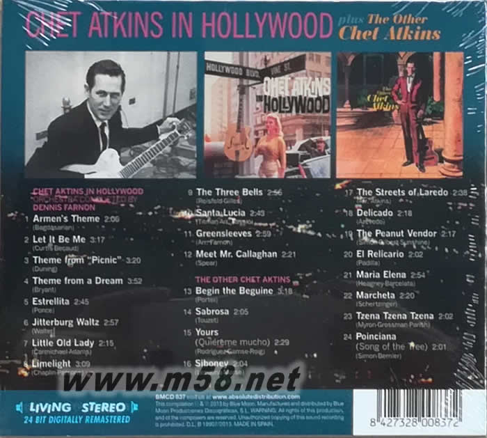 IN HOLLYWOOD PLUS THE OTHER CHET ATKINS 在好萊塢 吉它 (發(fā)燒音響推介)(m58.net) Chet Atkins in Hollywood及The Other Chet Atkins兩張TAS上榜天碟,無論在選曲、錄音或演奏,均是完美,共24首歌曲,沒有刪剪,二合為一。殿堂級(jí)結(jié)他手,音樂風(fēng)格更深深地影響了后世?結(jié)他手,曾推出約七十多張個(gè)人作品,總銷售量超越七千五百萬張,共獲取十四座格萊美獎(jiǎng),更是鄉(xiāng)村音樂名人堂的藝人。In Hollywood 是1959年作品,當(dāng)年只用了小量樂器錄音,但Chet Atkins表現(xiàn)出個(gè)人的指法和技巧,使音樂豐富多變,名曲多首包括Let It Be Me、Greensleeves、Santa Lucia等等,最佳的民謠原曲爵士化之示范。The Other Chet Atkins名副其實(shí)是一張使人眼前一亮,展現(xiàn)出他的另一面作品,不演奏其首本鄉(xiāng)村音樂,是一張百分百的西班牙結(jié)他專輯,1960年推出,柔情的Chet Atkins與溫暖的Gibson結(jié)他。