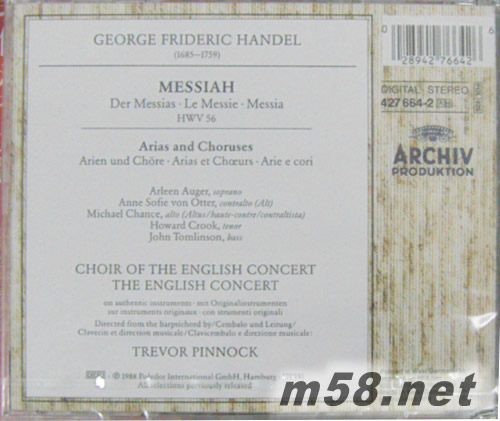 韓德爾:神劇彌賽亞&著名詠嘆調(diào)與合唱曲Handel:Messiah& Arias&Choruses(m58.net) 這套《亨德爾:彌賽亞》由Archive唱片公司發(fā)行于1989年,特雷沃•平諾克指揮英國協(xié)奏團(tuán)及合唱團(tuán)演奏錄制。 亨德爾為著名的英籍德國作曲家,生于德國哈勒,師從管風(fēng)琴家查豪學(xué)習(xí)作曲,后在教堂內(nèi)任管風(fēng)琴師及藝術(shù)指導(dǎo)。因愛世俗音樂,亨德爾乃于1703年遷居漢堡——當(dāng)時唯一有民族歌劇的德國城市,開始從事歌劇的創(chuàng)作。1706年后,亨德爾在漢堡威爾及倫敦兩地進(jìn)行創(chuàng)作,不久成為英國的音樂權(quán)威人士。1717年定居英國,1726年,亨德爾加入英國籍。 他一生共創(chuàng)作了《阿爾西那》、《奧蘭多》等46部歌劇,除五部外,其余均在倫敦創(chuàng)作。從30年代末開始,從事于沒有舞臺表演的清唱劇創(chuàng)作。其間亨德爾共寫了32部清唱劇,絕大部分是在英國創(chuàng)作的,對英國的音樂產(chǎn)生了深遠(yuǎn)的影響。他的代表作有管弦樂曲《皇家水上音樂》、《皇家焰火音樂》,清唱劇《彌賽亞》等,其中《彌賽亞》中的《哈利路亞》流傳最為廣泛。 《彌賽亞》這一清唱劇作于1741年9月,作曲家亨德爾在一種不可遏止的熱情沖動下,只用了20多天就寫出了這部注定要成為經(jīng)典之作的清唱劇《彌賽亞》。這部作品是作者“流著眼淚寫作”而成的,同樣也打動了1743年在倫敦音樂廳觀看首演時的所有聽眾,甚至英王喬治二世在聽完第二幕終曲《哈利路亞》這一合唱后,起立以示敬意。這一舉動竟形成了傳統(tǒng),直到今天,人們在現(xiàn)場欣賞合唱《哈利路亞》時,都必須全體起立以示敬意。 “彌賽亞”一詞源于希伯萊語,意為“受膏者”。后被基督教用于對救世主耶穌的稱呼。全劇分三部分,共有序曲、詠嘆調(diào)、重唱、合唱、間奏等57首分曲。第一部分?jǐn)⑹鍪胍d的誕生;第二部分是關(guān)于耶穌為拯救人類,四處傳播福音以及受難而被釘死于十字架上的經(jīng)歷;第三部分則是耶穌顯圣復(fù)活的故事和贊美詩。這是亨德爾少數(shù)完全表現(xiàn)宗教內(nèi)容的作品中最出色的一部,實際上其中對音樂的戲劇性和人性的宣揚遠(yuǎn)勝于對宗教的虔誠感情。全劇為主調(diào)和聲音樂風(fēng)格,以旋律優(yōu)美、和聲洗練見長。西西里民間樂器風(fēng)笛的使用在當(dāng)時是大膽而新穎的。由于其中不少分曲具有很高的技術(shù)訓(xùn)練價值和藝術(shù)性,至今仍在音樂會和聲學(xué)教學(xué)中被廣泛采用。整個作品經(jīng)典迭出,美不勝收。 英國本土古樂指揮大師特雷沃•平諾克與他親手創(chuàng)立的英國協(xié)奏團(tuán)所演繹的巴洛克作品在專業(yè)評論界是擁有極高評價的。平諾克對古樂深厚的研究以及英國協(xié)奏團(tuán)清澈、明快的音色,在唱片中顯露無遺。特雷沃•平諾克的演繹既具有德國式的嚴(yán)謹(jǐn),又具有英國式的清新和優(yōu)雅。作為深受60、70年代風(fēng)行歐洲的古樂運動影響的一員,平諾克在組建英國合奏團(tuán)之初就確立了仿古樂器在樂團(tuán)中的主導(dǎo)地位。除了使用仿古樂器,他們還盡可能使用古代的演奏方式,追求一種真實而質(zhì)樸的演奏效果。他曾經(jīng)說過這樣的話:“歷史是有趣的,但在舞臺上歷史幾乎沒有它的一席之地,而對于我們音樂家而言,古樂器已經(jīng)超越了歷史而成為音樂表情的有機(jī)成分。” 英國協(xié)奏樂團(tuán)為英國最優(yōu)秀的室內(nèi)樂樂團(tuán)之一,1973年由平諾克和斯坦奇等人創(chuàng)建。樂團(tuán)偏重于巴洛克時期的音樂,追求“原本”的真實和演奏風(fēng)格的純正。他們認(rèn)真地研究和考證樂譜和各種文獻(xiàn),在維多利亞和阿爾伯特博物館的支持下,利用館藏多年的古樂器來演奏,力求獲得和展現(xiàn)巴洛克時期音樂的精髓和原始風(fēng)貌。20多年來,這支古樂團(tuán)從小到大、不斷發(fā)展,除每年定期到歐美及亞洲等地舉行音樂會外, 還經(jīng)常在許多世界著名的音樂節(jié)上登臺,像雪斯維格—霍斯坦音樂節(jié)、圣西西里亞音樂節(jié)、愛丁堡音樂節(jié)等。1988年,英國協(xié)奏樂團(tuán)在薩爾茨堡音樂節(jié)上演出亨德爾的《彌賽亞》,受到好評。此后,便成為該音樂節(jié)的常客。