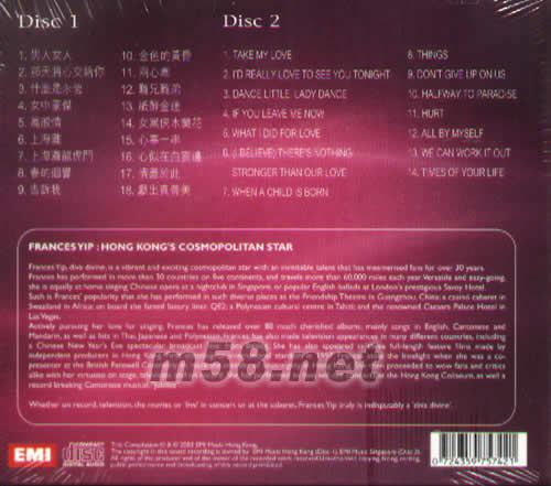 Disc 1 1、男人女人 2、那天將心交給你 3、什么是永恒 4、女中豪杰 5、萬般情 6、上海灘 7、上海灘龍虎門 8、春的回音 9、告訴我 10、金色的黃昏 11、雨心牽 12、難兄難弟 13、紙醉金迷 14、女黑俠木闌花 15、心事一串串 16、心似是而非在白云邊 17、情書于此 18、獻出真善美 Disc 2 1.TAKE MY LOVE 2.I'D REALLY LOVE TO SEE YOU TONIGHT 3.DANCE LITTLE LADY DANCE 4.IF YOU LEAVE ME NOW 5.WHAT I DID FOR LOVE 6.(I BELIEVE)THERE'S NOTHING STRONGER THAN OUR LOVE 7.WHEN A CHILD IS BORN 8\THINGS 9.DON'T GIVE UP ON US 10\HALFWAY TO PARADISE 11.HURT 12.ALL BY MYSELF 13.WE CAN WORK IT OUT 14.TIMES OF YOUR LIFE