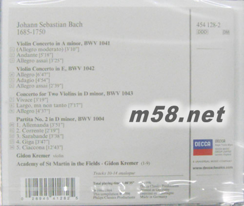 1. Violin Concerto No.1 in A minor, BWV 1041 - 1. (Allegro moderato) 2. Violin Concerto No.1 in A minor, BWV 1041 - 2. Andante 3. Violin Concerto No.1 in A minor, BWV 1041 - 3. Allegro assai 4. Violin Concerto No.2 in E, BWV 1042 - 1. Allegro 5. Violin Concerto No.2 in E, BWV 1042 - 2. Adagio 6. Violin Concerto No.2 in E, BWV 1042 - 3. Allegro assai 7. Concerto for 2 Violins, Strings, and Continuo in D minor, BWV 1043 - 1. Vivace 8. Concerto for 2 Violins, Strings, and Continuo in D minor, BWV 1043 - 2. Largo ma non tanto 9. Concerto for 2 Violins, Strings, and Continuo in D minor, BWV 1043 - 3. Allegro 10. Partita for Violin Solo No.2 in D minor, BWV 1004 - 1. Allemande 11. Partita for Violin Solo No.2 in D minor, BWV 1004 - 2. Corrente 12. Partita for Violin Solo No.2 in D minor, BWV 1004 - 3. Sarabande 13. Partita for Violin Solo No.2 in D minor, BWV 1004 - 4. Giga 14. Partita for Violin Solo No.2 in D minor, BWV 1004 - 5. Ciaccona