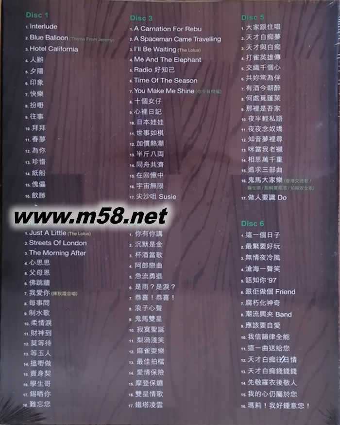 CD1 1. Interlude, 2. Blue Balloon, 3. Hotel California, 4.人辦, 5.夕陽, 6.印象, 7.快樂, 8.扮嘢,9.往事,10.拜拜, 11.春夢, 12.為你, 13.珍惜, 14.紙船, 15.傀儡, 16.飲勝 CD2 1. Just A Little (The Lotus), 2. Streets Of London, 3. The Morning After, 4.心思思, 5.父母恩6.佛跳墻, 7.我愛你(陳秋霞合唱) 8.每事問 9.制水歌 10.柔情淚 11.財神到 12.莫等待13.等玉人, 14.搵嘢做 15.賣身契 16.學(xué)生哥 17.錫曬你 18.難忘您 CD3 1. A Carnation for Rebu, 2. A Spaceman Came Travelling, 3. I'll Be Waiting (The Lotus) , 4. Me And The Elephant, 5. Radio好知己, 6. Time Of The Season,7. You Make Me Shine (你令我閃耀), 8.十個女仔, 9.心里日記, 10.日本娃娃, 11.世事如棋, 12.加價熱潮, 13.半斤八兩, 14.同舟共濟(jì), 15.在回憶中, 16.宇宙無限, 17.尖沙咀 Susie CD4 1.你有你講, 2.沉默是金3.杯酒當(dāng)歌, 4.阿郎戀曲, 5.急流勇退, 6.是雨?是淚?, 7.恭喜!恭喜!, 8.浪子心聲, 9.鬼馬雙星, 10.寂寞圣誕, 11.梨渦淺笑, 12.麻雀耍樂, 13.最佳拍檔, 14.愛情保險, 15.摩登保鑣, 16.雙星情歌, 17.鐵塔凌云 CD5 1.大家跟住唱, 2.天才白癡夢, 3.天才與白癡, 4.打雀英雄傳, 5.交織千個心, 6.共妳常為伴, 7.有酒今朝醉, 8.何處覓蓬萊, 9.那里是吾家, 10.夜半輕私語, 11.夜夜念奴嬌, 12.知音夢里尋, 13.咪當(dāng)我老襯, 14.相思萬千重, 15.追求三部曲, 16.鬼馬大家樂-香港交通歌,醫(yī)生頌,點解要擺酒,拍拖安全歌 17.做人要識Do CD6 1.這一個日子, 2.最緊要好玩, 3. 無情夜冷風(fēng), 4.滄海一聲笑, 5.話知你97, 6.跟佢做個 Friend, 7.腐朽化神奇8. 潮流興夾Band, 9.應(yīng)該要自愛, 10.我信韻律全能, 11.這一曲送給您, 12.天才白癡往日情, 13.天才白癡錢錢錢, 14.先敬羅衣后敬人, 15.我的心仍屬於您, 16.瑪莉!我好鐘意您!