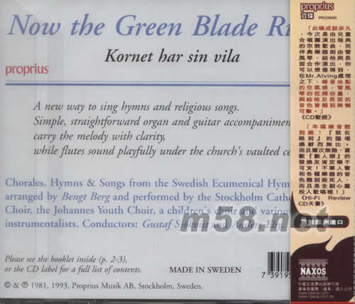 麥田之歌 大地頌贊(黃教堂)Now the Green Blade Riseth(m58.net) [錄音地點(diǎn)的空氣感,管風(fēng)琴的低頻份量,與結(jié)他及長笛的音色皆靚到無懈可擊.] [本碟錄音靚到絕![就在眼前]的臨場感鮮烈無比.] [此碟成就非凡,今次是由兒童合唱團(tuán)演出瑞典的宗教歌曲,而伴奏樂器則由管風(fēng)琴,結(jié)他與長笛合作演出,你可以想像得到,在MR .ALVING處理之下,錄音地點(diǎn)的空氣感,管風(fēng)琴的低頻份量,與結(jié)他及長笛的音色皆靚到無懈可擊.]