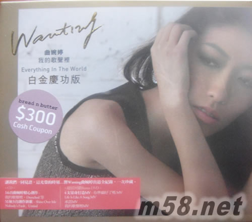 Everything In The World (白金慶功版) (CD + DVD)(m58.net) 唱作人曲婉婷在加拿大長大,憑悅耳動聽的歌聲和多年來的自彈自唱的創作方式,換來外國音樂公司的垂青,成為加拿大Nettwerk旗下的首位華人女歌手。曲婉婷首張英文創作專輯《Everything In The World》收錄了她在出道前為父母填寫的「Hide Away」和「Shell」,以及網絡劇《在線愛》的大熱國語歌「我的歌聲里」(You Exist In My Song)和電影《春嬌與志明》的主唱曲「Drenched」。第二版特別加收三首歌曲「快活」、「沒有什麼不同」、「你準備好了嗎」。 《Everything In The World》的銷量更已超越白金,慶功版額外輯錄四首MV,以及三首全新作品「Shine Over Me」、「Nobody's Fault」和「Untied」。