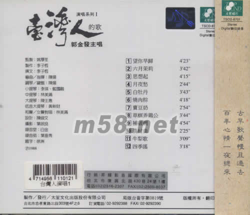 被譽(yù)為“百年珍藏”的發(fā)燒男低音天碟,不只獲得閩南語的知音人力捧,歌曲的美感更能沖破語言界限,直達(dá)每個(gè)人心扉。郭金發(fā)的低凌晨厚實(shí)飽滿自然,兼有溫和的震撼力,音像又大又凝聚,配合弦樂群的超水準(zhǔn)伴奏和發(fā)燒錄音,使每一首耳熟能詳?shù)那樱忌l(fā)出使人難為抗拒的迷人特質(zhì)。