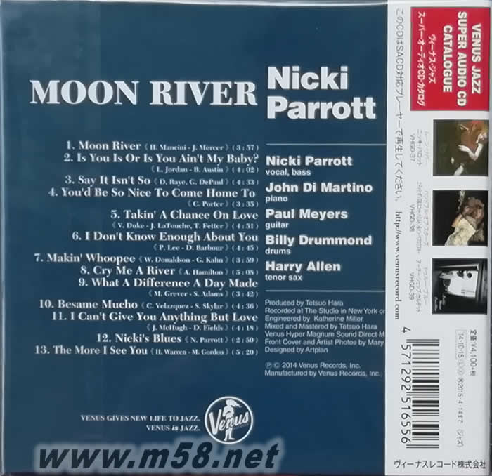 美國著名爵士女歌手及大提琴手Nicki Parrott金獎專輯,日本著名爵士品牌Venus Records以單層SACD推出,這個備受發燒友及音響界推崇的製式,提供如在現場欣賞的靚絕音效,伙拍鋼琴名家John Di Martino等演繹多首名曲包括: Moon River, You'd Be So Nice To Come Home To, Cry Me A River及Besame Mucho等, 原裝日本豪華厚紙限量版。