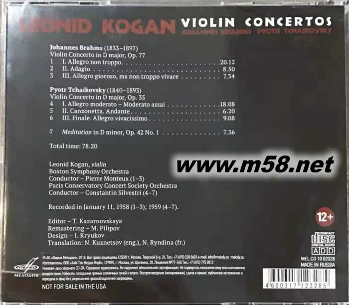 Violin Concertos 布拉姆斯/ 柴可夫斯基: 小提琴協奏曲/ 浪漫曲(m58.net) Leonid Kogan, Boston Symphony Orchestra, Pierre Monteux, Paris Conservatory Concert Society Orchestra, Constantin Silvestri、 布拉姆斯:小提琴協奏曲(官方版首度CD化!!) /*柴可夫斯基: 小提琴協奏曲/ 浪漫曲(op.42, No.1) 柯崗 (Leonid Kogan)小提琴 蒙都(Pierre Monteux)指揮 波士頓交響樂團 *Contantin Silvestri 指揮 巴黎音樂院管弦樂團 俄羅斯小提琴大師傳世名版 俄羅斯原裝進口,原廠母帶精心轉製