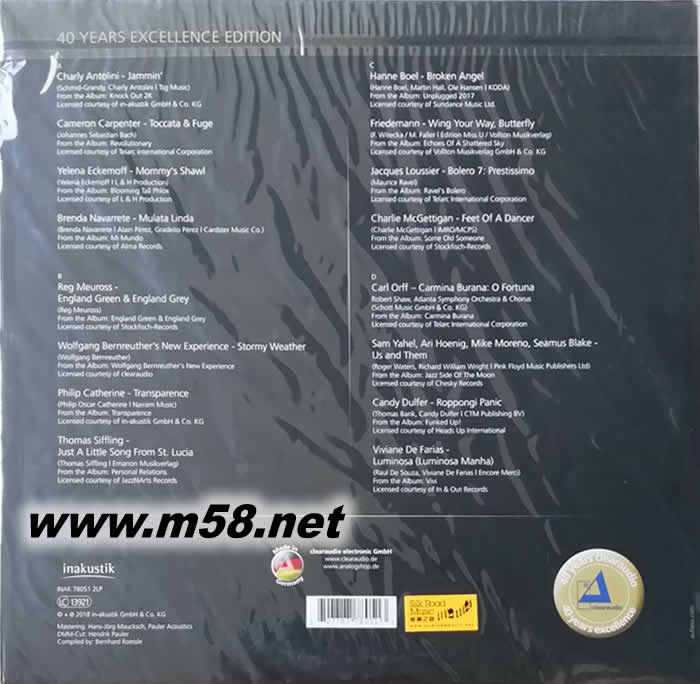 清澈 40周年紀念卓越鑒聽盤 Clearaudio 40 Years Excellence Edition 雙黑膠(m58.net) 德國品牌「淸澈(Clearaudio)」製造的音響器材特別是黑膠唱片播放組合在黑膠界穩(wěn)執(zhí)牛耳,經(jīng)過不斷淬煉,其產(chǎn)品多項專利製作標誌著模擬重播技術的高峰,是追求極級音效的「發(fā)燒」樂迷夢寐以求的音響設備。 2. 公司自1978年成立后,其商標底下特意刻上「Loving Music」(鐘愛音樂),這是公司的經(jīng)營宗旨,追求音樂的真實性(looking for musical truth)是永恆的目標,他們冀望所生產(chǎn)的器材能讓聽者能夠彷如重回錄音現(xiàn)場,有真實再臨的感覺,他們的堅毅配合優(yōu)秀創(chuàng)新的技術,使他們成為業(yè)界的最佳典范。 3. 2018年是「清澈」成立四十週年,廠方安排了不少慶祝活動和項目以彰顯公司在多年所取得的成就,其中之一是與專門製作和出版高質素錄音的「德國原音(Inakustik)」合作,精心泡製一套無論是音樂或音效皆是上乘之作以回饗他們多年來的支持者,同時亦展示他們的經(jīng)營宗旨和目標 - 鐘愛音樂和追求音樂的真實性,優(yōu)越的硬件器材需要出色的錄音輭件配合才能得到相得益彰,互相輝映的作用。 4. 專輯<「淸澈(Clearaudio)」 - 40週年紀念卓越鑑聽盤(Clearaudio - 40 Years Excellence Edition)>所挑選的歌曲皆是用作鑑聽和測試器材設備的中、高、低音,空間感,解像度,動態(tài)范圍,音場的平行和人聲的表現(xiàn)等但音樂可聽性極高的樂曲,顯赫的專業(yè)技術,最接近原來錄音的音色、音場和音效,特別是以HQCD為載體,效果更為突出。