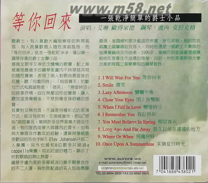 聽爵士,有人喜歡大編制樂隊的熱鬧氣氛;也有人就喜歡個人隨性演唱風格。而「等你回來」就是一張乾乾凈凈、僅以單一鋼琴伴奏的爵士女聲小品。
