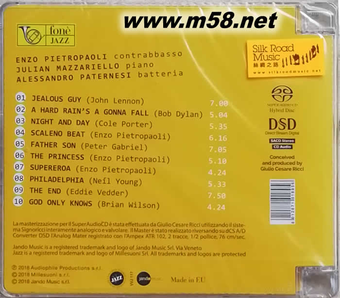 皮埃特羅帕里,馬斯薩里爾盧,帕特尼斯 [公主]Pietropaoli,Mazzariello ,Paternesi [The Princess] SACD(m58.net) Enzo Pietropaoli (contrabasso)、 Julian Mazzariello (piano)、Alessandro Paternesi (batteria) Selling point : 1. 恩佐.皮埃特羅帕里(Enzo Pietropaoli)是意大利著名爵士樂低音結他手,他創立的「恩佐.皮埃特羅帕里爵士樂四重奏(Enzo Pietropaoli Quarter)」是當今意大利最具實力和最受歡迎的爵士樂隊之一,而琴鍵手朱利安.馬斯薩里爾盧(Julian Mazzariello)及鼓手亞歷山德羅.帕特尼斯(Alessandro Paternesi)亦是成員之一,他們合作純熟,無比默契。 2. 專輯<公主(The Princess)>是他們三為一體作新的嘗試,皮埃特羅帕里負責演奏低音大提琴,鋼琴由馬斯薩里爾盧彈奏,配合鼓手帕特尼斯演奏多首流行經典名曲包括約翰•列儂的「嫉妒男兒(John Lennon: Jealous Guy)」、鮑勃•迪倫的「暴雨將會御下(Bob Dylan: A Hard Rain's A Gonna Fall)」、科爾•波特的「日與夜(Cole Porter: Night And Day)」、彼得•蓋布瑞爾的「父子(Peter Gabriel: Father Son)」、尼爾.楊格的「佛羅里達(Neil Young: Philadelphia)」及皮埃特羅帕里創作的主題曲「公主(The Princess)」,首首精彩。 3. 三位樂手全情投入,使出渾身解數,淋漓盡致地演繹每首歌曲,使這些名作添上新的色彩和感染力。 4. 專輯的后期處理和母盤制作以最精密器材和精巧技術處理,配以傳真度極高的SACD為載體,帶來更完美更真實的發燒爵士樂鑒聽盤。