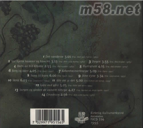 01、Det sandeste 02、Mit hjerte hamrer og hamrer 03、Dagen 04、Barn av Bla Krukke 05、Hurtigrute 06、Berg og bare 07、Kobenhavnerkneipe 08、Sang til byen 09、Dine oyne 10、Skrik 11、Alle vet jo det 12、Gate ved gate 13、Sorgen og gleden de vandre tilhope 14、Erindring