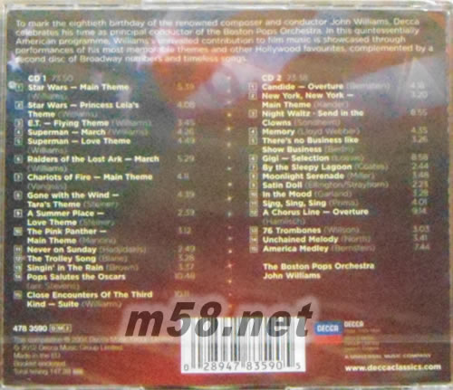 A CELEBRATION歡慶-約翰威廉士80歲生日慶賀專輯A CELEBRATION(古典愛好者必備)(m58.net) 錄:星際大戰、E.T. 外星人、超人、法柜奇兵、火戰車、亂世佳人、粉紅豹、雨中歡唱、紐約,紐約、貓、月光小夜曲、歌舞線上 等名曲 Star Wars, E.T., Superman, Raiders of the Lost Arc, etc. 約翰.威廉士 指揮 波士頓通俗管弦樂團 JOHN WILLIAMS & THE BOSTON POPS ORCHESTRA 這份合輯,是為了慶祝電影配樂家約翰威廉士八十歲生日,而集結他過去親自指揮波士頓通俗管弦樂團的錄音精選而成。這長達兩個半小時的精選輯中,第一張主要是收集約翰威廉士早年的電影配樂作品,包括「超人」、「外星人」、「第三類接觸」、「法柜奇兵」等片中的經典配樂。第二片則是收錄他指揮演奏過去經典電影配樂和舞臺劇中的主題,包括「紐約,紐約」、「貓」、「飛燕金槍」、「金粉世界」、「歌舞線上」等舞臺劇中的名曲。 約翰威廉士出生於一九三二年,在他六十年的電影配樂生涯中,幾乎獨佔了近三十年來所有暢銷電影的主題配樂工作。尤其是他和大導演史提芬史匹柏合作的配樂,幾乎每部都是膾炙人口,叫好又叫座。史匹柏的電影都獨衷由威廉士擔任配樂,所有的電影作品只有兩部不是由威廉士配樂。 威廉士的配樂作品先后曾獲得五座奧斯卡金像獎、二十一座葛萊美獎,四十七次的奧斯卡提名,其提名次數之高,史上只有華德迪士尼超越他。他在一九八零到一九九三年間擔任波士頓通俗管弦樂團的首席指揮,卸任后也被聘為該團終生桂冠指揮,與該團合作關係密切。該團創於一八八五年,至今(2012年)已有一百二十七年的悠久歷史。這是由波士頓交響樂團團員組成的演奏團體,早年由亞瑟費德勒帶領,非常的受到喜愛。