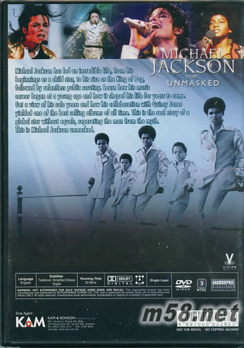 Micheal Jackson has led an incredible life, from his beginnings as a child star, to his rise as the King of Pop, followed by relentless public scrutiny. Learn how his music career began at a young age and how it shaped his life for years to come. Get a view of his solo years and how his collaboration with Quincy Jones yielded one of the best selling albums of all time. This is the real story of a global star without equals, separating the man from the myth. This is Michael Jackson unmasked. 譯:邁克爾杰克遜已導致令人難以置信的生命,從他開始作為童星,他的崛起成為流行樂之王,其次是無情的公眾的監督。了解他的音樂生涯開始于一個年輕的年齡和它如何影響他的生活多年。獲得鑒于他獨奏年和他的合作昆西瓊斯取得了一個最暢銷的專輯之一。這是真正的故事,一個全球性不等于明星,分離男子的神話。這是邁克爾杰克遜揭露。