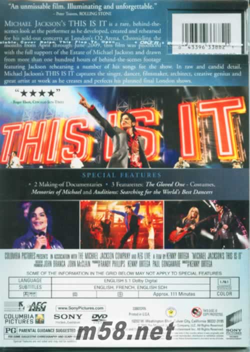 THIS IS IT DVD 美國版(m58.net) 這一天,跟MJ生前未竟的演唱會“This Is It”同名的演唱會電影將在國內正式上映,其中文名為《天王終點》。《天王終點》的素材來自MJ生前彩排時側錄的數百小時影像,不光呈現了MJ最后的舞臺風采,還展現了他在選曲、舞蹈、舞臺設計、編舞、音樂、燈光等每個環節事必躬親的過程。制作人說:“我們都是為了他來到這里,來繼續他未竟的事業。”跟MJ合作的女吉他手則說:“邁克爾是一個神奇的人。”《天王終點》由與杰克遜合作籌劃演唱會的肯尼·奧特加執導。除了上面提到的,片中還將收錄杰克遜專門為演唱會準備的全新錄影帶,其中包括全新版的名曲《顫栗》。影片以高分辨率畫質及高科技數字音效完成,其中部分場景更以3D立體視效呈現。影片將于10月28日在北美和中國臺灣、10月29日在中國香港、10月30日在內地上映,限時兩周。票房的部分收益將歸杰克遜資產授權單位,用來照顧杰克遜的母親凱瑟琳及他的三個子女,還有部分將用于慈善。“他的夢想激勵了全世界,但他自己還有一個夢想要跟每一個人分享。”
