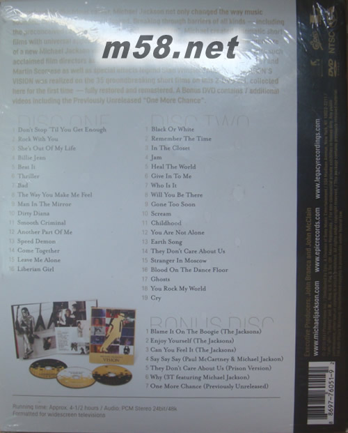 【麥可杰克森-飆視界:音樂電影短片全記錄】3DVD超豪華精裝版,超過4個半小時的內容,完整收錄麥可杰克森掀起娛樂產業革命,將流行音樂帶入視覺新紀元,創造出獨一無二的流行文化風潮的音樂電影短片。這套3DVD限量套裝收錄40部音樂電影短片,其中10部是之前從未發行過DVD,首次曝光的還有「節奏藍調天王」勞凱利(R. Kelly)為麥可所寫的《One More Chance》,所有影像與聲音都經過重新修復,全新的影音品質勢必帶給觀眾無比的視覺震撼。