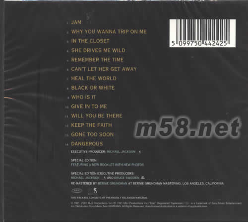 1.JAM 2.WHY YOU WANNA TRIP ON ME 3.IN THE CLOSET 4.SHE DRIVES ME WILD 5.REMEMBER THE TIME 6.CAN'T LET HER GET AWAY 7.HEAL THE WORLD 8.BLACD OR WHITE 9.WHO IS IT 10.GIVE IN TO ME 11.WILL YOU BE THERE 12.KEEP THE FAITH 13.GONE TOO SOON 14.DANGEROUS