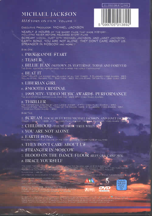 SIDE ONE 1.PROGRAMME START 2.TEASER 3.BILLIE JEAN(MOTOWN 25:YESTERDAY,TODAY AND FOREVER) 4.BEAT IT 5.LIBERLAN GIRL 6.SMOOTH CRLMINAL 7.1995 MTV VIDEO MUSIC AWARDS PERFORMANCE 8.THRILLER SIDE TWO 1.SCREAM(VOCAL DCET WITH MICHAEL JACKSON,AND JANET JACKSON) 2.CHILDHOOD(THEME FROM"FREE WILY 2) 3.YOU ARE NOT ALONE 4.EARTH SONG 5.THEY DON'T CARE ABOUT US 6.STRANGER IN MOSCOW 7.BLOOD ON THE DANCE FLOOR(REFUGEE CAMP MIX) 8.BRACE YOURSELF