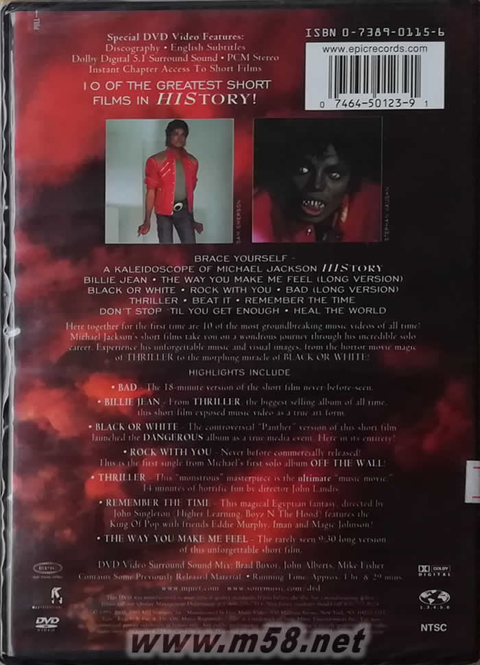 Here together for the first time are 10 of the most groundbreaking music videos of all time!Michael Jackson s short films take you on a wondrous journey through his incredible solo career.Experience his unforgettable music and visual images,from the horror movie magic of THRILLER to the morphing miracle of BLACK OR WHITE!