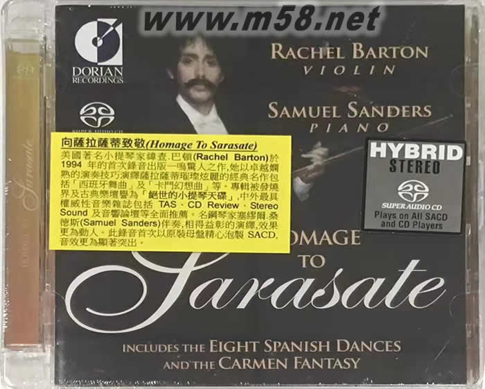 向薩拉薩蒂致敬 Rachel Barton Homage To Sarasate SACD(m58.net) Rachel Barton緯查·巴頓 (violin)、 Samuel Sanders塞繆爾·桑德斯 (piano) 美國(guó)著名小提琴家緯查·巴頓於1994年的首次錄音出版一鳴驚人之作,她以卓越嫻熟的演奏技巧演繹薩拉薩蒂璀璨炫麗的經(jīng)典名作包括「西班牙舞曲」及「卡門幻想曲」等。 專輯被發(fā)燒界及古典樂(lè)壇譽(yù)為「絕世的小提琴天碟」,中外最具權(quán)威性音樂(lè)雜誌包括TAS、CD Review、Stereo Sound及音響論壇等全面推薦。 緯查·巴頓採(cǎi)用1617年阿瑪悌家族(Amati)所精製之名琴「羅布柯維茲(Lobkowitz)」締造那美得令人窒息的音色,使這專輯更為亮麗奪目。 名鋼琴家塞繆爾·桑德斯伴奏,相得益彰的演繹,效果更為動(dòng)人。 此錄音首次以原裝母盤精心泡製SACD,音效更為顯著突出。