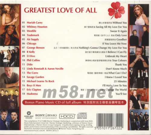 GREATEST LOVE OF ALL(m58.net) 為感情注入幸運(yùn)原素 栽種出只屬于你們的愛情四葉草 內(nèi)附歌詞 HDCD音效處理 特別版附送鋼琴音樂Bonus CD