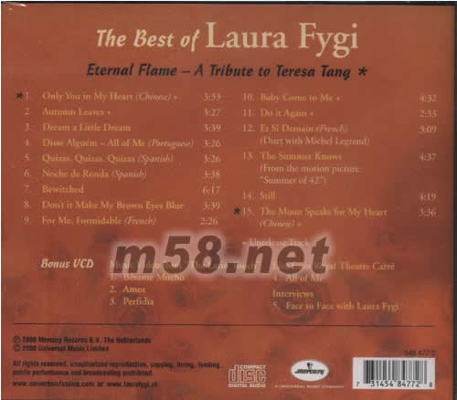 價格為估,以實到貨為準! THE BEST OF LAURA FYGI(m58.net) 蘿拉·菲琪(Laura Fygi)是繼傳奇爵士樂歌手Bille Holiday、Ella Fitzgerald、Dinah Washington后的新一代爵士樂天后。而與她的前輩們所不同的是 : 如果說,曾經苦難的歲月讓 Bille Holiday的嗓音浸入了太多的滄桑,那么,蘿拉的嗓音則多了幾分優雅和從容…… 蘿拉,這位兼具荷蘭與埃及血緣的歐洲混血兒,氣質中更擁有一份 Sophia Loren貴族式的神秘與浪漫;而在厄瓜多爾和烏拉圭的生長經歷則使她的音樂融合了大量熱烈、奔放的拉丁音樂元素。 假如,音樂是一種無形的載體,那么,蘿拉·菲琪( Laura Fygi)的音樂所承載著的,恰是泛著神秘與浪漫的情愫,恰是洋溢著拉丁風情的曼妙JAZZ……