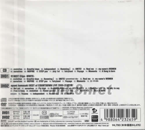 CD 01.evolution 02.Greatful days 03.independent 04.Humming[7/4] 05.UNITE! 06.Real me 07.my name's WOMEN 08.ourselves 09.INSPIRE 10.STEP you 11.July 1st 12.fa.iryland 13.Voyage 14.Moments 15.A Song is born [Disc 2]〈DVD〉〈A BEST Clips-WHITE-〉 01.evolution 02.Greatful days 03.Humming[7/4] 04.UNITE! (promotional clip) 05.Real me 06.my name's WOMEN 07.ourselves 08.INSPIRE 09.STEP you 10.fairyland 11.Voyage 12.Moments 13.(TV-CM) [Disc 3]〈DVD〉〈ayumi hamasaki BEST of COUNTDOWN LIVE 2006-2007 A〉 01.Not yet 02.ourselves 03.Fly high 04.Beautiful Fighters 05.NEVER EVER 06.A Song for ×× 07.No way to say 08.Free&Easy 09.evolution 10.flower garden 11.until that Day... 12.AUDIENCE 13.Boys&Girls 〈encore〉 14.Trauma 15.independent 16.Humming[7/4] 17.BLUE BIRD