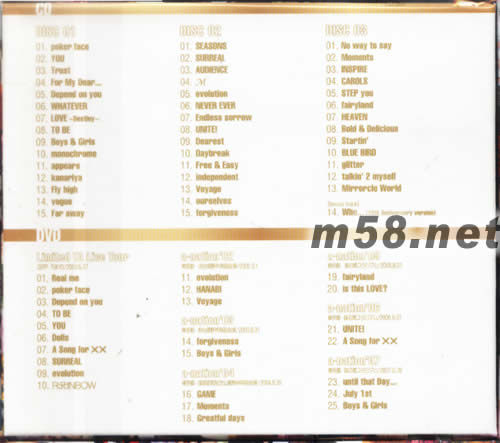 《DVD収録內容》 (全25曲収録 ※全曲完全未発売ライヴ映像?。?br>○ Limited TA Live Tour (ZEPP TOKYO:2003.5.27) 01.Real me 02.poker face 03.Depend on you 04.TO BE 05.YOU 06.Dolls 07.A Song for ×× 08.SURREAL 09.evolution 10. ○ a-nation'02 (お臺場野外特設會場 / 2002.9.1) 11.evolution 12.HANABI 13.Voyage ○ a-nation'03 (お臺場野外特設會場 / 2003.8.31) 14.forgiveness 15.Boys & Girls ○ a-nation'04 (國営昭和記念公園野外特設會場 / 2004.8.29) 16.GAME 17.Moments 18.Greatful days ○ a-nation'05 (東京都・味の素スタジアム / 2005.8.21) 19.fairyland 20.is this LOVE? ○ a-nation'06 (味の素スタジアム / 2006.8.27) 21.UNITE! 22.A Song for ×× ○ a-nation'07 (味の素スタジアム / 2007.8.26) 23.until that Day... 24.July 1st 25.Boys & Girls