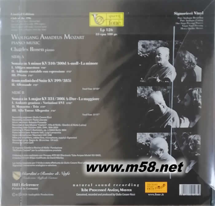 5. 殿堂級錄音師里茲(Giulio Cesare Ricci)採用最頂級的錄音器材,精巧的技術,以純模擬方式融合他所創的「里奇制式」(Signoricci)製作,別具個人風格與吸引力,配合以180克, 33 1/3轉黑膠盤為載體,鋼琴琴音更為鏗鏘、自然和真實,美妙的音符隨著交錯的黑白鍵連綿不斷地滲透出來,令人感到心曠神怡。全球發行限量496張,彌足珍貴。