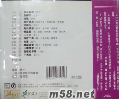 幽蘭逢春(m58.net) 八九年五月十大最佳古典CD之一 --香港電臺第四臺 杜沖的演奏原出他是一位全才,十四首曲子都是不同角度的動態曲目 --純音樂雜志/送延益 極度傳神而逼真的錄音,是受樂者所必藏 --臺灣.音樂與音響雜志 杜沖師徒趙松庭和陸春齡.不僅技巧了得,且能奏出各自不同的韻味 --文匯報 他原盡才華,以瑰麗逼人的吹奏幾種樂器.伴以豐滿充盈富有跳躍生命力. --星加坡.聯合早報/黃卓倫 [帝女花]主題曲原來取材[妝臺秋思].低音大笛主奏,音色悲怨,惹人愁思.細致度極高,皆像立體動人 --音響世界/LEO