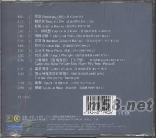 1、愜意 BLESSINGS 2、想思意大利 DEEP IN LOVE 3、秋風 AUTUMN BREEZE 4、G小調隨想 CAPRICE IN G MINOR 5、閑聊波瀾卡 CHIT-CHAT POLKA 6、霓裳曲 RAINBOW COLOURED RAIMENT 7、醉笛 DRUNKEN DIZI 8、江河水 RIVER WATER 9、放馬山歌 SONG OF WRANGLER 10、交響組曲《云南音詩》 SYMPHONIC SUITE YUNNAN TONE POEM “FIRE TORCH FESTIVAL” 11、雷波風情 CUSTOM OF LEIBO 12、陽光照耀著塔什庫瀾干 THE SON SHINES OVER TAXKORGAN 13、沖擊 IMPACT 14、夢醒 APRES UN REVE