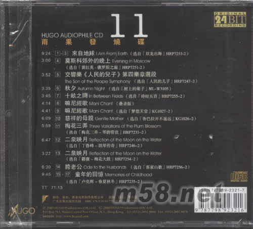 1-3 來自地球 I AM FROM EARTH 4、莫斯科郊外的晚上 EVENING IN MOSCOW 5、交響樂《人民的兒子》第四樂章選段 THE SON OF THE PEOPLE SYMPHONY 6、秋夕 AUTUMN NIGHT 7、十畝之間 IN BETWEEN FIELDS 8、嘛尼經(jīng)歌 MANI CHANT(疊錄版) 9、嘛尼經(jīng)歌 MANI CHANT(選自《夢想天堂》) 10、慈祥的母親 GENTLE MOTHER 11、梅花三弄 THERR VARIATIONS OF THE PLUM BLOSSOM 12、二泉映月 REFLECTION OF THE MOON ON THE WATER(丁魯峰-胡琴傳奇) 13、二泉映月 REFLECTION OF THE MONN ON THE WATER(籍薇-梅花大鼓) 14、夸老公 ODE TO THE HUSBANDS 15-17 童年的回憶 MEMORIES OF CHILDHOOD