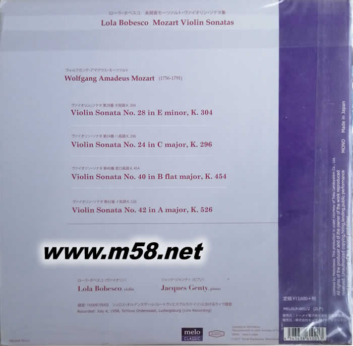 博貝斯庫 莫扎特小提琴奏鳴曲 MOZART VIOLIN SONATAS 黑膠 日本版(m58.net) 莫扎特/貝多芬:小提琴奏鳴曲>2LP,博貝絲庫未發(fā)表錄音,博貝絲庫是羅馬尼亞20世紀最優(yōu)秀的小提琴家,她的臺上魅力驚人,配合她使用的喬瓦尼.巴蒂斯塔.瓜雅達里尼名琴,更將小提琴音樂提升至永恒的美樂。180克雙黑膠