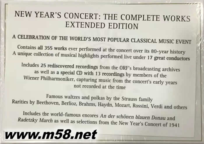 維也納新年音樂會套裝專輯2020版 慶祝古典音樂75周年(26CD 大套裝)(m58.net) 慶祝古典音樂75周年 索尼古典音樂公司在2015年發布了所有作品的完整版本 維也納愛樂樂團的新年音樂會。在“金色大廳”演出 在1941年至2015年間的博物館中,發布了標志性的現場表演 次放在一盒23張的光盤里。現在,在2020年,這個版本 將提供26張光盤的擴展版本,包括所有新曲目 在另外三張光盤上編輯。 這項的傳統始于1941年元旦, 奧地利指揮家克萊門斯·克勞斯舉辦了一場全施特勞斯家族的音樂會 直到他在1954年去世——除了1946-47年,約瑟夫·克里普斯取代了他的位置—— 克勞斯塑造了音樂會的形象。那些年它只在電臺播出。 在克勞斯的繼任者,愛樂樂團首席小提琴手威利·博斯科夫斯基的領導下 手拿小提琴站著指揮這場音樂會不下25次 正如約翰·施特勞斯自己所做的那樣,電視廣播開始了,很快 成為全世界觀眾喜愛的活動。