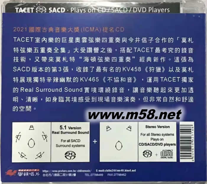 莫扎特 海頓弦樂四重奏 Mozart : String Quartet in C Major Kv 465 - in B Flat Major Kv 458 獰獵 SACD專輯背面圖片