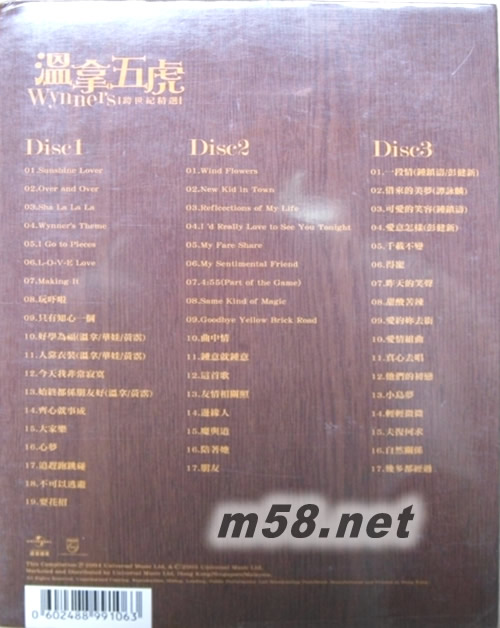 CD1 1. Sunshine Lover 2. Over and Over 3. Sha La La La 4. Wynner`s Theme 5. I Go to Pieces 6. L-O-V-E Love 7. Making It 8. 玩嚇啦 9. 只有知心一個 10. 好學為福(溫拿/華娃/黃霑) 11. 人靠衣裝(溫拿/華娃/黃霑) 12. 今天我非常寂寞 13. 始終都係朋友好(溫拿/黃霑) 14. 齊心就事成 15. 大家樂 16. 心夢 17. 追趕跑跳碰 18. 不可以逃避 19. 耍花招 CD2 1. Wind Flowers 2. New Kid in Town 3. Reflcections of My Life 4. I `d Really Love to See You Tonight 5. My Fare Share 6. My Sentimental Friend 7. 4:55(Part of the Game) 8. Same Kind of Magic 9. Goodbye Yellow Brick Road 10. 曲中情 11. 鐘意就鐘意 12. 這首歌 13. 友情相關照 14. 邊緣人 15. 魔與道 16. 陪著她 17. 朋友 CD3 1. 一段情(鐘鎮濤/彭健新) 2. 借來的美夢(譚詠麟) 3. 可愛的笑容(鐘鎮濤) 4. 愛意怎樣(彭健新) 5. 千載不變 6. 得寵 7. 昨天的笑聲 8. 甜酸苦辣 9. 愛約妳去街 10. 愛情組曲 11. 真心去唱 12. 他們的初戀 13. 小島夢 14. 輕輕微微 15. 夫復何求 16. 自然關係 17. 幾多都經過