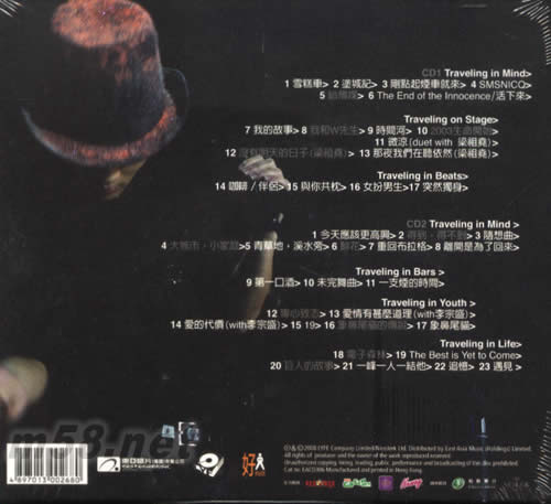 CD 1 Traveling in Mind 01. 雪糕車 02. 涂城記 03. 剛點起煙車就來 04. SMSNICQ 05. 給傳媒 06. The End of the Innocence/活下來 Traveling on Stage 07. 我的故事 08. 我和W先生 09. 時間河 10. 2003生命開始 11. 微涼(duet with 梁祖堯) 12. 沒有明天的日子(梁祖堯) 13. 那夜我們在聽依然(梁祖堯) Traveling in Beats 14. 咖啡 15. 與你共枕 16. 女扮男生 17. 突然獨身 CD 2 Traveling in Mind 01. 今天應該更高興 02. 得到,得不到 03. 隨想曲 04. 大城市,小家庭 05. 青草地,溪水旁 06. 鮮花 07. 重回布拉格 08. 離開是為了回來 Traveling in Bars 09. 第一口酒 10. 未完舞曲 11. 一支煙的時間 Traveling in Youth 12. 專心致志 13. 愛情有什么道理(with李宗盛) 14. 愛的代價(with李宗盛) 15. 19 16. 象鼻尾貓的傳說 17. 象鼻尾貓 Traveling in Life 18. 電子森林 19. The Best is Yet to Come 20. 巨人的故事 21. 一峰一人一結他 22. 追憶 23. 遇見