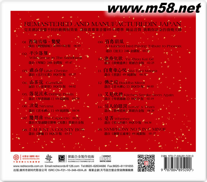 01.西施情殤-驚變 選自《傾國傾城》HQCD版 06:03 02.平沙落雁 Wild Geese in The Sandbank 選自《琴賦》HQCD版 07:47” 03.雞公仔 Little Chenke 選自《五行元素》HQCD版 03:37 04.山茶花 Camrllias 選自《十億掌聲》HQCD版 04:02 05.落花流水 Drifting Petals 選自《琴意綿綿1》HQCD版 03:59 06.涅盤 Nirvana 選自《云水禪心1》HQCD版 04:36 07.隨想曲 The Capriccio 選自大型通關交響樂《長征》HQCD版 03:52 08. I’M JUST A COUNTY BOY 選自《陳曦2》HQCD版 03:51 09.百鳥朝凰 A Hundred Bird Paying Tribute to Phoenix 選自《弦王》HQCD版 03:21 10.漁舟凱歌 Yu Zhou Kai Ge 選自《鼓樂盛典》HQCD版 02:25 11.白度母心咒 Sita Tara Mantra 選自《密語》HQCD版 04:32 12.佛之境 Buddha Mirror 選自《云水禪心2》HQCD版 04:03 13.又見炊煙 Kitchen Smoke Seen Again 選自《琴意綿綿2》HQCD版 02:19 14.情人的眼淚 Lover’s Tears 選自《蔡琴經典》HQCD版 04:29 15.是否 Whether 選自《別人的歌》HQCD版 04:34 16. SYMPHONY NO.5 IN C MINOF 選自《銅管五重奏》HQCD版 05:37