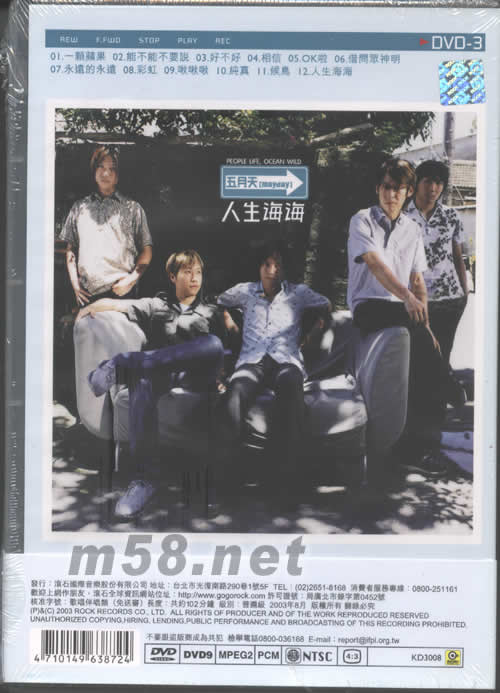 價格為估,以實到貨為準! 人生海海 MV+KARAOKE DVD(m58.net) 請點看產品正、背面大圖 亞洲搖滾第1天團 五月天回來了 臺灣第3張[五月天]挑戰全世界最熱的夏天 未來在上生海海之上 自由在五月天空之上 不論你去哪里 五月天永遠在這里陪著你 相信純真 一切就會OK啦 迎向彩虹五月天 五月天 人生海海 12首MV/KARAOKE 完整收錄