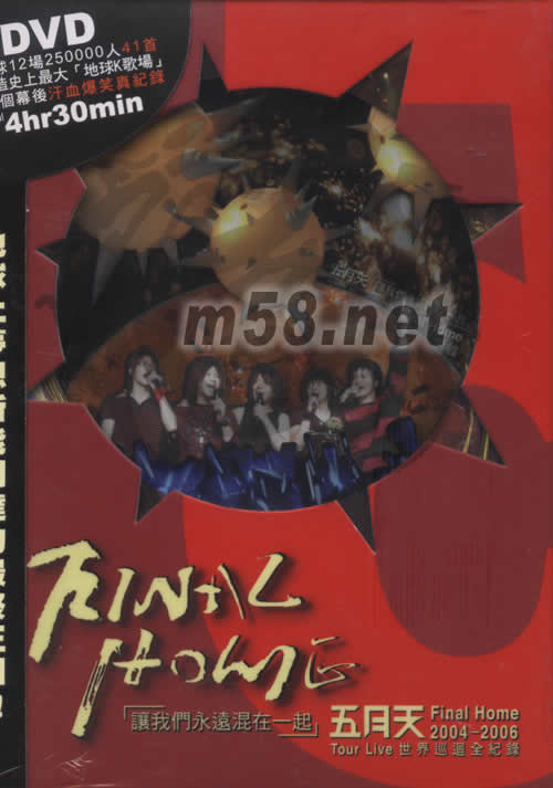 2004-06Final Home演唱會全記錄DVD [讓我們永遠混在一起](m58.net) [讓我們永遠混在一起] 五月天Final Home 2004-2006 Tour Live 世界巡回全紀錄 3DVD全球12場250000人41首 創造史上最大[地球K歌場] 15個幕后汗血爆笑真紀錄 total 4hr30min DVD 2+1 收錄演唱會完整內容,加贈巡回演唱會精采幕后花絮全長約4小時30分鐘 預購即可獨得五月天 Final Home小巨蛋紀念海報乙張 60701004號訂單獲得以下幸運大禮: 五月天2006春季號白色T恤A款(限量版) [T恤]一件!