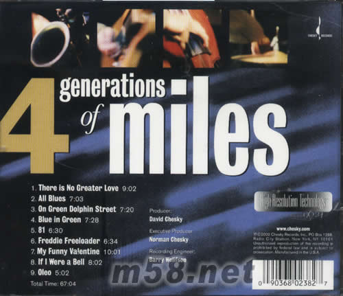 4 Generations of Miles(m58.net) 在這張現場專輯中所演奏精選自邁爾士作品的「黃金曲目」,時空橫跨不同時期的不朽金曲,讓聽眾樂迷無不跟著音樂的情緒起伏澎湃;四位樂手更以天賦的卓越技巧、不同時期的Miles觀點與深刻內涵,呈現出前所未有的嶄新風貌,在現場演出中昇華為無瑕的感動。四位碩果僅存的經典樂手,延續大師不滅的爵士能量,完成了這項完美的「不可能的任務」。且讓我們一同來聆賞這縱橫半世紀的經典樂音[DH][DH][DH]四代名家的邁爾士歌頌 *現場作品一般最擔心的效果問題,莫過於向位所造成的各項樂音的平衡度,以及臺上臺下互動間的舖陳,在這張專輯中難能可貴的完美交融,以Chesky的獨門收音絕技,配合96kHz[SL]24Bit的高解析錄音,即使如Freddie Freeloader這樣飽滿的歌曲,一樣能夠有明確的紋理,使您在體會完全不輸錄音室作品的清晰度之際,更能如臨現場般,盡興享用樂手幾近完美的演出,在此向您誠懇推薦專輯中所有一氣呵成的經曲名曲**all about jazz →這一晚Miles Davies在他們的音樂中復活了!**AMG四顆星評鑑 →合作無間的默契及綿源不絕創意,讓這場演出成為所有『Miles Davies』致敬專輯中之「最經典」! *專業發燒錄音評鑑stereophile →2002[SL]11月號『最佳錄音』專輯!JazzReview.com →爵士樂壇萬千期盼,黃金組合終於重現,如此經典的演出不會再有了!