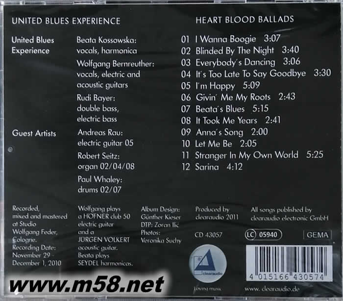 藍調結他手WOLFGANG BERNREUTHER聯同牛筋老友RUDI BAYER第六張作品,配合女聲BEATA KOSSOWSKA組成為UNITED BLUES EXPERIENCE。近年來推出的藍調結他作品不算多,又像樣、錄音又出眾的更少,UNITED BLUES EXPERIENCE 十二首全新作品,難得的好聽,就如標題所說出一樣,抒情藍調歌曲,男聲、女聲和口琴主、和音。不再一玩再玩前輩所有出名歌曲,自己所創作之作品首首達至可進入經典階級,一下子或許成為后輩的名曲,唔信?還記得B_ella 2004年Track of Heart (心聲共鳴)一碟成名嗎?吸引了無數之發燒樂迷,更吸引了無數結他愛好者,Heart Blood Ballads (心聲再共鳴) 絕對是今年的不二發燒之選。