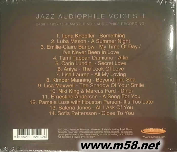 發燒金點 - 爵士名伶續章 JAZZ AUDIOPHILE VOICES II(m58.net) 本張專輯集結了獲獎無數的發燒女聲以《爵士女伶》系列寫下唱片行極高斷貨率和詢問度的發燒名廠 Premium續集。延續24bit/192kH極清澈透析的人聲錄音,是高品質的最佳保證。本張專輯集結了獲獎無數發燒女聲Niki King、經典不敗的Salena Jones、懷念金曲〝I’ve Never Been In Love Before〞、〝Beyond The Sea〞、年度最佳爵士女伶Emilie-Claire Barlow等珍貴女伶音樂饗宴。如果您在過去收藏了無數爵士女伶專輯或者開始入門,這都是一張無敵珍貴的發燒名盤。