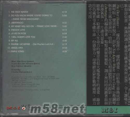 1 THE DEER HUNTER 2 DO YOU KNOW WHERE YOURE GOING TO ~THEME FROM MAHOGANY~ 3 LIBERTANGO 4 MY HEART WILL GO ON ~TITANIC LOVE THEME~ 5 ENDLESS LOVE 6 LA VIE EN ROSE 7 I WILL ALWAYS LOVE YOU 8 MY ALL 9 PAVANE LACHRYME ~Der Fluyten Lust-hor~ 10 ANGEL EYES 11 SIMPLE SONG