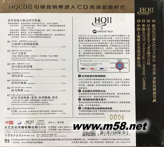 1 弗里茨·克萊斯勒 CN-Z35-17-00003 04:36 宣敘調(diào)與諧謔隨想曲 2 帕格尼尼 CN-Z35-17-00006 10:40 引子與變奏 (改編于帕歇埃洛歌劇《女磨坊主》中的唱段“我心中惆悵”) 3 威廉·恩斯特 CN-Z35-17-00002 08:51 夏日zui后的玫瑰 4 克萊斯勒 CN-Z35-17-00001 03:24 愛的悲傷 5 帕拉迪斯 CN-Z35-17-00007 02:54 西西里舞曲 6 阿爾貝尼茨 CN-Z35-17-00005 02:33 探戈舞曲 7 巴赫 CN-Z35-17-00004 07:48 薩拉邦德舞曲-變奏-布列舞曲-變奏 (選自巴赫《b小調(diào)第一帕提塔組曲》作品BWV1002) 8 巴赫 CN-Z35-17-00008 05:50 行板(選自巴赫《a小調(diào)無伴奏小提琴奏鳴曲》作品BWV1003)