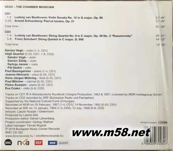 CD1: Beethoven: Violin Sonata No. 10 in G major, Op. 96 Schoenberg: Pierrot lunaire, Op. 21 CD2: Beethoven: String Quartet No. 9 in C major, Op. 59/3 “Rasumovsky” Schubert: String Quintet in C major, D. 956