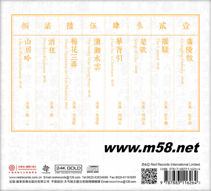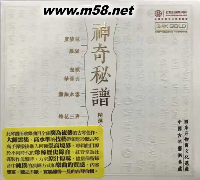 神奇秘譜 古琴大師合輯 24K GOLD CD 金碟(m58.net) 神奇秘譜是明太祖之子朱權編纂的古琴譜集,成書於明初洪熙乙巳(西元1425年),是現存最早的漢族琴曲專集。書中所收六十四首琴曲是編者從當時『琴譜數家所裁者千有余曲』中精選出來的,其中頗有一些歷史上很有影響力的名作。由於古代漢族音樂不如其他文物那樣便於保存,所以許多古曲不是失傳了,就是面目全非,因此古琴譜中保存的古曲,被唐人認為『唯彈琴家猶傳楚漢舊聲』。古曲是總結前人音樂創作經驗,探索傳統音樂規律所不可缺少的依據?!渡衿婷刈V》全書共分三卷。上卷稱《太古神品》,收十六首作品。在各曲之前都寫有詳盡的題解,將琴曲的淵源演變情況和樂曲的表現內容作了介紹,段落、指法、音位也標寫的很清楚。此譜是研究古琴音樂的重要資料,具有很高的使用價值和史料價值。