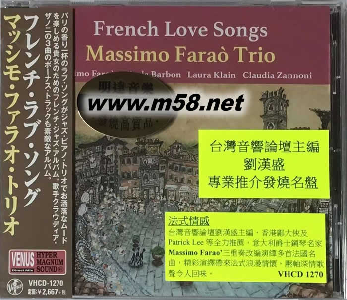 法式情感 爵士鋼琴三重奏 FRENCH LOVE SONGS 法國愛情之歌日本版NENUS(鋼琴、貝斯、鼓)(m58.net) Massimo Farao - piano Nicola Barbon - bass Laura Klain - drums Claudia Zannori - vocals (2, 4, 7) 義大利鋼琴名家馬斯莫.法羅與他的兩位老搭檔在2018年推出多張爵士標準曲的專輯,獲得市場上極佳的反響。這次他把焦點轉向迷人的法式情歌,特別邀請聲線女歌手Claudia Zannori擔任演唱的工作,收錄「玫瑰人生」(La Vie En Rose)、「大海」(La Mer)以及「秋葉」(Les Feuilles Mortes)多首經典香頌,用爵士鋼琴三重奏的美妙和聲,帶您徜徉在巴黎浪漫的情懷中。 Recorded at Riverside Studio in Torino on August 11 and 12, 2018.