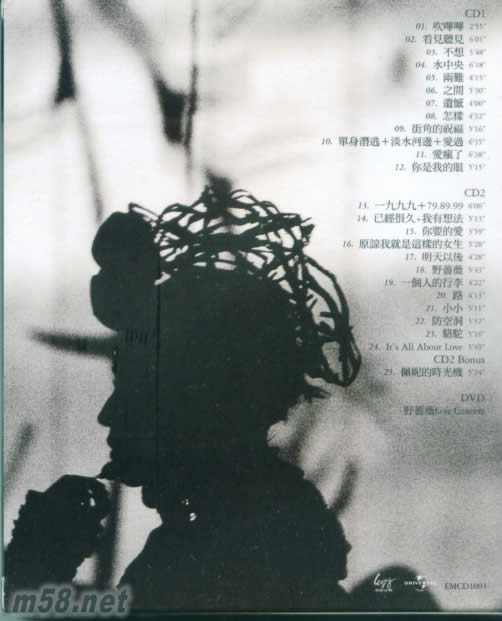 戴佩妮 野薔薇 2009 Live Concert 10年的 盛開 凋零 永遠(yuǎn)的 含蕾 綻放 一朵 為愛 永不低頭 的 野薔薇 戴佩妮 2009 Live Concert 10年精選曲目 雙CD+1DVD 全新推薦:野薔薇/明天以后/駱駝 10年的焠鏈菁華:怎樣、不想、水中央、街角的祝福、你要的愛、愛瘋了…等 膾炙人口:真情歌、野薔薇、明天以后、駱駝全新推薦現(xiàn)場演唱 9月16日 全面發(fā)行 戴佩妮【野薔薇】專輯里,收錄了2009年演唱會(huì)的24首演唱及影像記錄(2CD+1DVD) ,除了收錄一開場用自己的歌曲「吹嗶嗶」改編成全臺(tái)首創(chuàng)的人體打擊秀,佩妮和樂手在身上裝滿觸發(fā)式電子開關(guān),共有45個(gè)開關(guān)在7個(gè)人身上同時(shí)代表了7種樂器, 還以四大主題,【盛開】,【凋零】,【含蕾】,【綻放】區(qū)分了十年來佩妮的情歌,創(chuàng)作,包括【盛開】中Penny身穿豹紋小洋裝,不想再安分做大家心目中的創(chuàng)作才女,站上鋼琴大彈吉他,特地獻(xiàn)唱「兩難」感謝爸爸寫了漂亮的書法字。與師弟方炯鑌合唱「之間」,並收錄了阿鑌感謝師姐讓他沒有遺憾所演唱的「遺憾」。 【凋零】佩妮唱出了「街角的祝福」,「愛瘋了」等在愛情里失落的歌。 【含蕾】主題上,Penny更唱出了對旁人的內(nèi)心話,一曲「我有想法」唱到「我不是沒有想法,只是不想再多說話」,「原諒我就是這樣的女生」以及新歌「明天以后」佩妮詮釋了花朵經(jīng)歷了風(fēng)霜,也讓自己儲(chǔ)備了含蕾之后【綻放】的能量。 最后的【綻放】,Penny當(dāng)然演唱了同名的新歌「野薔薇」,高唱我是一朵為愛永不低頭的野薔薇,並在Ending曲「It’s all about Love」中告訴大家,因?yàn)閻鬯缘倪@一切也感謝這一路上歌迷及所有愛她的人支持她的任性與堅(jiān)持。 而Bonus曲目「佩妮的時(shí)光機(jī)」,濃縮了包含:不想+你要的愛+街角的祝福+防空洞+愛瘋了+明天以后的六首也是這10年來愛情歷程的呈現(xiàn)。 《CD曲目》 【盛開】1.吹嗶嗶 2.看見聽見 3.不想 4.水中央 5.兩難 6.之間 7.遺憾 【凋零】8.怎樣 9.街角的祝福 10.單身潛逃+淡水河邊+愛過 11.愛瘋了 12.你是我的眼 【含蕾】13.一九九九+79.89.99 14.已經(jīng)很久+我有想法 15.你要的愛 16.原諒我就是這樣的女生 17.明天以后 【綻放】18.野薔薇 19.一個(gè)人的行李 20.路 21.小小 22.防空洞 23.駱駝 24.Its All About Love 25.佩妮的時(shí)光機(jī)