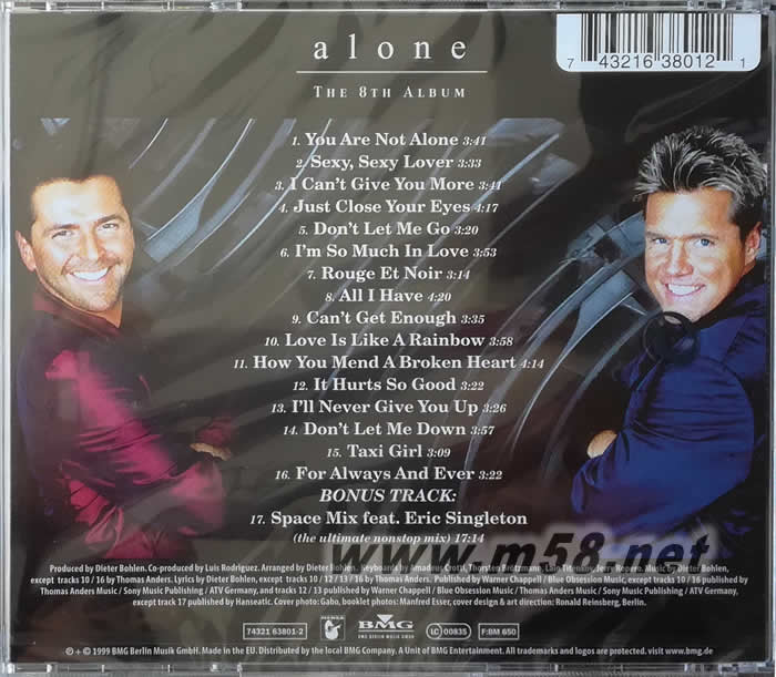 Alone - The 8th Album(m58.net) Modern Talking 是一支德國流行音樂雙人組合,由Thomas Anders和Dieter Bohlen組成。 直到目前為止,Modern Talking在商業上最成功的德國流行組合。他們的曲調給人印象深刻,演唱的歌詞則采用英語。 說起80年代的歐式舞曲旋風,當中最具代表性的就非Modern Talking(摩登淘金合唱團)莫屬了。《Brother Louie》(路易兄弟)是摩登淘金最經典的一首歌(也就是港樂《連鎖反應》的原曲)。 音樂類型:Euro Disco,Eurodance,Synthpop,Hi-NRG,Italodisco