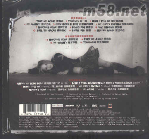 UNDER MY SKIN酷到骨子里曲目: Disc 1 1. Take Me Away 2. Together 3. Don't Tell Me 4. He Wasn't 5. How Does It Feel 6. My Happy Ending 7. Nobody's Home 8. Forgotten 9. Who Knows 10. Fall To Pieces 11. Freak Out 12. Slipped Away BONUS LIVE TRACKS 13、NOBODY‘S HOME 14、TAKE ME AWAY 15、HE WASN’T 16、TOMORROW SPECIAL EDITION BONUS DVD 1、UNDER MY SKIN 2、BONEZ TOUR DOCUMENTARY 3、DON‘T TELL ME 4、MY HAPPY DENDING 5、NOBODY’S HOME 6、HE WASN‘T