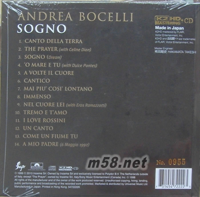 Sogno大地之夢 (K2HD)(m58.net) 首度推出 K2HD發(fā)燒CD版 日本Memory Tech壓制 強勁動態(tài)音效,音色更細致橫溢! 2013年HIFI SHOW 力撐, 神級發(fā)燒天碟. 世界首次K2化發(fā)行 傾德波伽利的歌聲,讓您由俗世的紛亂嘈雜中,跌進美好的夢之土,在那里陽光為萬物重新染上鮮明的色彩,大地沒有疆界,而人心也不再有距離。「大地之夢」是對生命的歌詠,是超越一切橫逆的力量,是讓心靈深處悸動的愛情。 義大利人是最善於唱歌的民族。這張專輯主打歌曲「大地情歌」由1997年全球最轟動的歌曲Time to say goodbye「告別的時刻」原班人馬所創(chuàng)作,氣勢恢宏壯闊。溫柔守護愛人歸來的「夢」,「我在顫抖但我愛你」以隱喻遣責(zé)戰(zhàn)爭,慧黠的酒吧邂逅插曲「我愛羅西尼」,到鄉(xiāng)愁的旋律「絕不再那么遙遠」,波伽利的詮釋完美融合傳統(tǒng)與現(xiàn)代的義大利式音樂風(fēng)格。 與流行天后席琳狄翁的深情二重唱「祈禱」不但是全球獎最佳原聲帶歌曲,也是本屆奧斯卡金像獎提名最佳原聲帶歌曲。另專輯還有義大利流行巨星拉瑪佐第(Eros Ramazzotti)前來助陣跨刀合唱「心中的她」及與葡萄牙歌后彭特絲(Duice Pontes)的二重唱「海與你」。 安德烈.波伽利獨特的性感嗓音,似水晶般清澈穿透人心,又高亢壯麗一如雄偉山河,而最令人感動的是他的歌聲所蘊涵的真摯情感,能超越言語的隔閡,即使不懂義大利歌詞,您能聽得懂他的心。